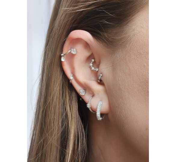 Upper Lobe (2 i 3 dziurka): To ich naturalne miejsce! Genialnie uzupełniają stylizację w wyższych partiach płatka, dodając jej tekstury obok gładkich kolczyków bazowych. Będą idealnym uzupełnieniem dla Bubble hoops czy błyszczących Crystal white hoops.
