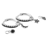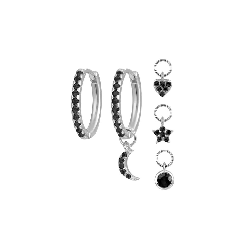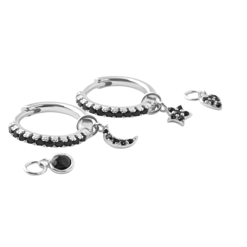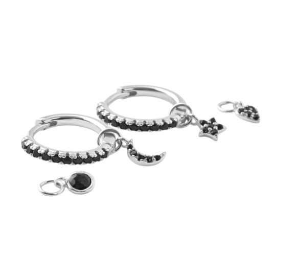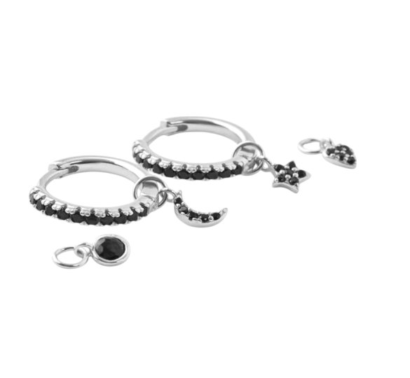 hey! Hoops with black charms - srebrne kolczyki z zawieszkami. Stwórz swój własny, niepowtarzalny styl tymi pięknymi kolczykami! Kolczyki, do których możesz dobrać własne zawieszki, spośród 4 różnych zawieszek, dzięki czemu możesz je dowolnie mieszać i dopasowywać. Daj się ponieść kreatywności i stwórz osobisty akcent