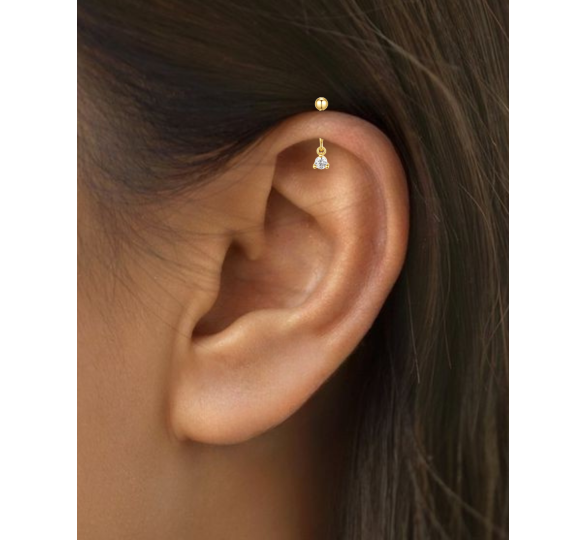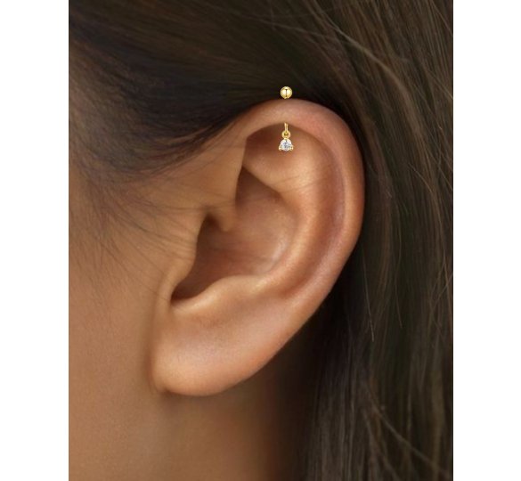 hey! Crystal vertical helix piercing - pozłacany kolczyk piercingowy do przekłucia vertical helix. Delikatnie opada i subtelnie łapie światło przy każdym ruchu. Prosty, a jednocześnie pełen wdzięku – stworzony z myślą o nowoczesnych stylizacjach ucha, które łączą minimalizm z odrobiną błysku.