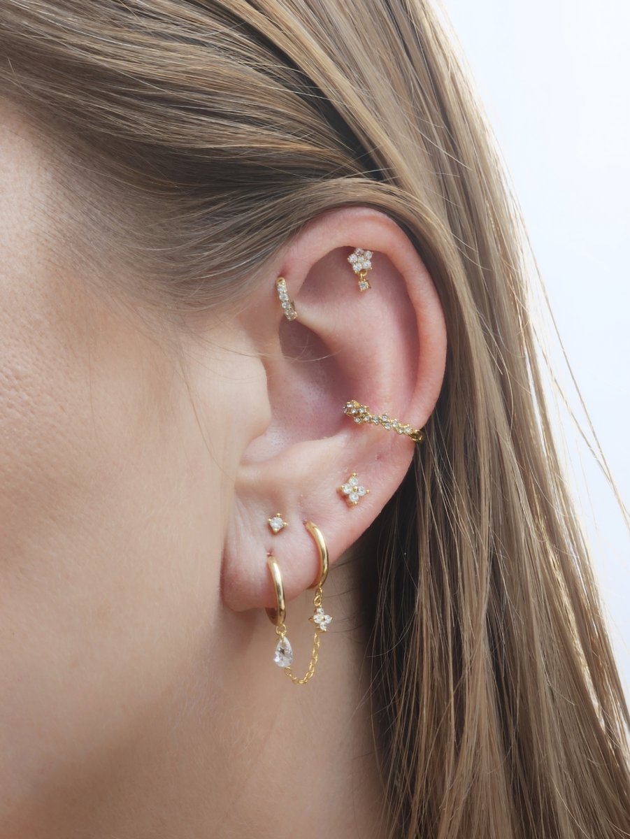 hey! Flower dangle labret - pozłacany kolczyk piercingowy typu labret, niezwykle subtelny a zarazem elegancki motyw kwiatu z delikatną zawieszką. Idealny do przekłuć w chrząstce typu; helix, mid helix, flat, tragus.