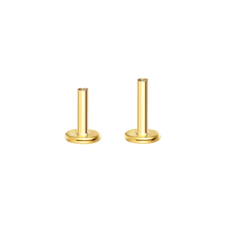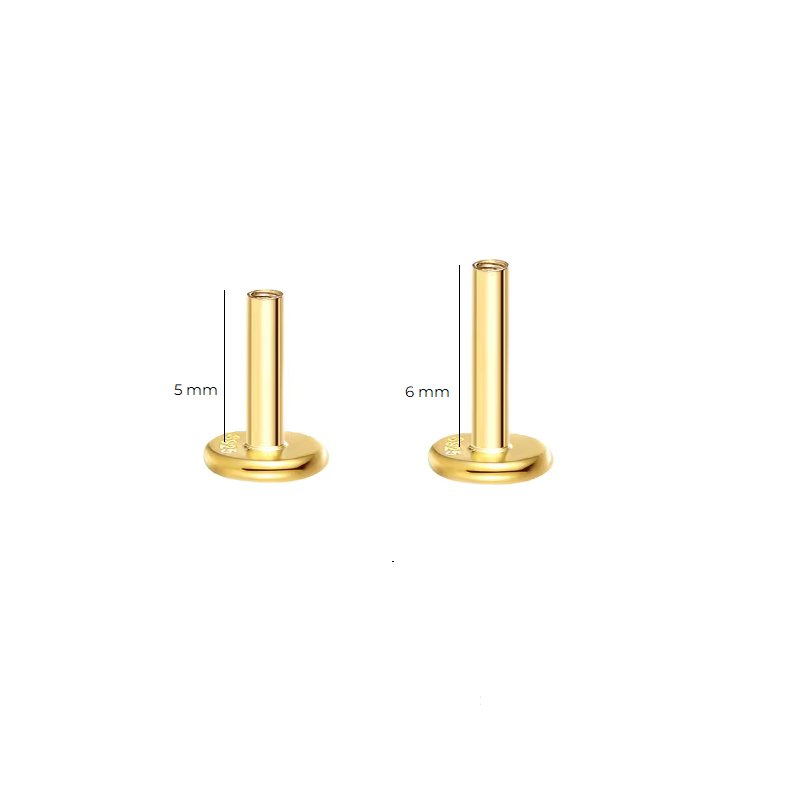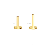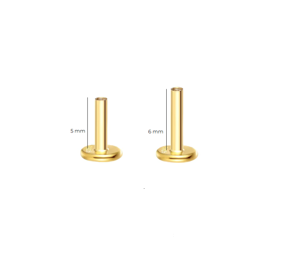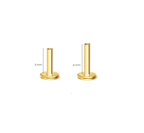 hey! Labret 6 mm - pozłacana płaska stopka typu labret o długości 6 mm pasuje do naszych labretów z tym samym gwintem — możesz swobodnie wymieniać ozdobne zakrętki i dopasowywać długość stopki do konkretnego przekłucia.